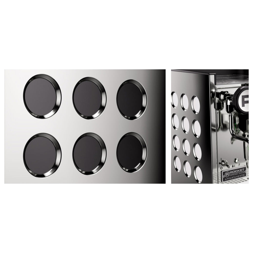 Die großen runden Aussparungen in den Seitenpanelen sind durch Einlagen in verschiedenen Farben individualisierbar und machen das Design sehr modern und attraktiv. Zusätzlich bleiben die doppelten Seitenpaneele während des Betriebes deutlich kühler, so dass die Maschine auch sehr nah an anderen Gegenständen stehen kann. Das Druckmanometer, die schöne massive E61 Brühgruppe, die großen und handlichen Drehventilgriffe für Dampf und Heißwasser verleihen der Vorderfront der kleinen Rocket eine klare und moderne Optik, das absolut zeitgemäß und formschön wirkt.