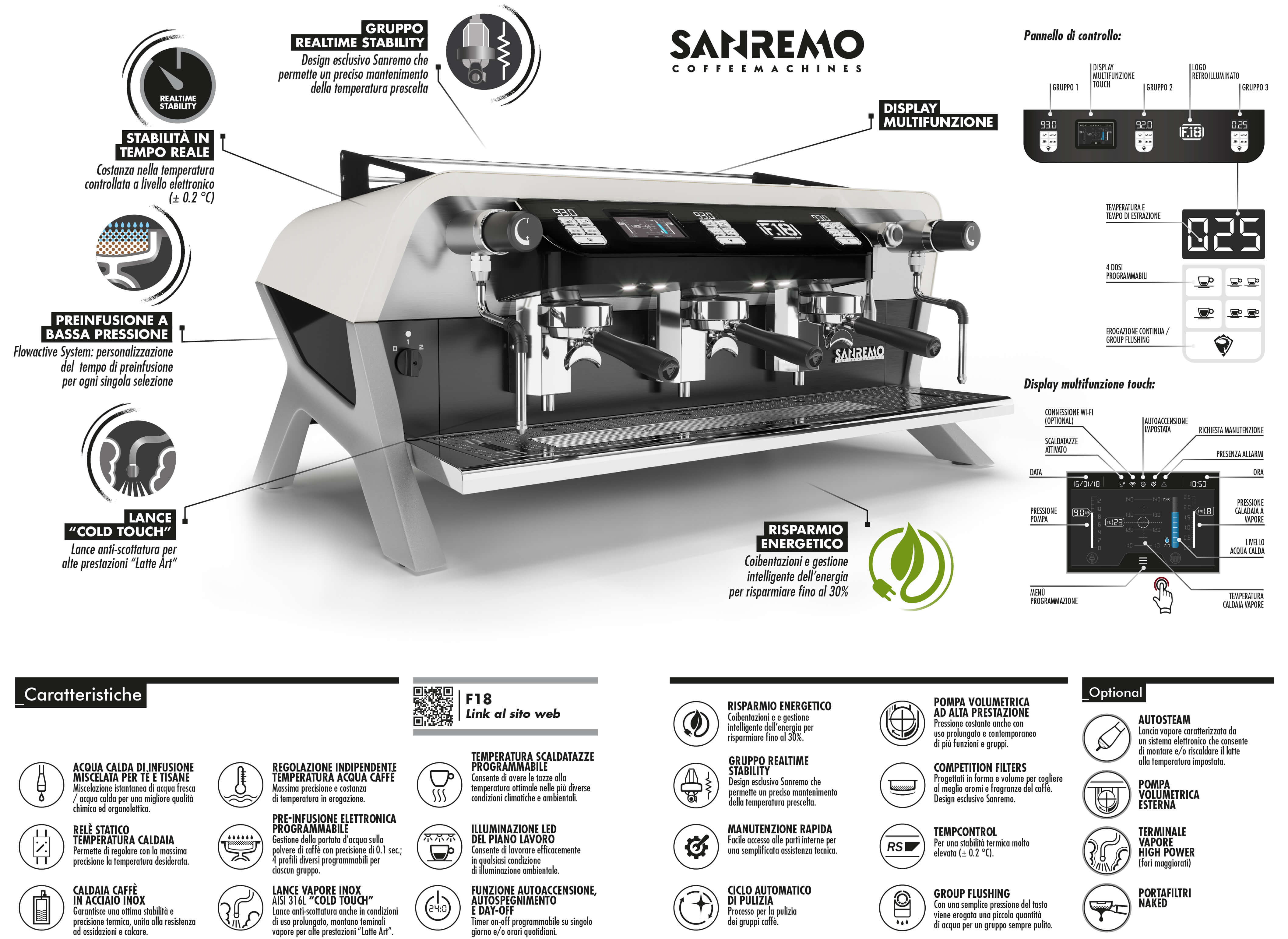 Die Sanremo F18 ist mit einem Multifunktions-SMARTouch-Bildschirm ausgestattet. Das bietet dem Barista bestmöglichen Komfort und Bedienerfreundlichkeit. Jede Brühgruppe verfügt über eine Anzeige der Gruppentemperatur über dem Ausgabefeld für die vorprogrammierten Kaffeeausgaben. Der Benutzer interagiert auf einfache und intuitive Weise mit dem Barista-Menü und allen Hauptfunktionen. Jede Gruppe wird dabei separat gesteuert. Die beiden Cold-Touch-Dampflanzen kombinieren die Sicherheit des Arbeitens ohne Verbrennungsgefahr