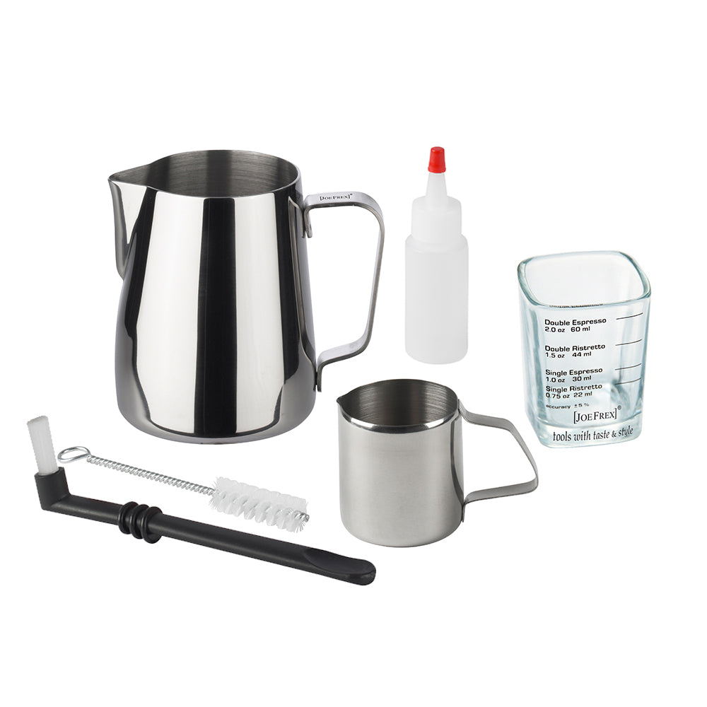 Für die Zubereitung eines bekömmlichen Espressos oder Kaffee-Mischgetränk ist neben der Pflege Kaffeemaschine, die Mengebestimmung des Espressos oder Zubereitung der Milch wesentlicher Bestandteil. Mit diesem 6-Teiligem Barista Set von JoeFrex bekommen Sie die dafür nützlichen Tools für den täglichen Gebrauch.