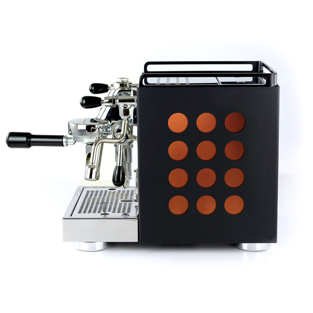 Die großen runden Aussparungen in den Seitenpanelen sind durch Einlagen in verschiedenen Farben individualisierbar und machen das Design sehr modern und attraktiv. Zusätzlich bleiben die doppelten Seitenpaneele während des Betriebes deutlich kühler, so dass die Maschine auch sehr nah an anderen Gegenständen stehen kann. Das Druckmanometer, die schöne massive E61 Brühgruppe, die großen und handlichen Drehventilgriffe für Dampf und Heißwasser verleihen der Vorderfront der kleinen Rocket eine klare und moderne Optik, das absolut zeitgemäß und formschön wirkt.